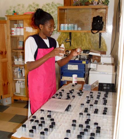 A Kenyan nurse preparing meds for the children. Med containers are used film cannisters--great resourcefulness and recycling!