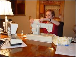 Barb Bodner, checking out sewing machines before packing. Believe it or not, THREE of them fit into my suitcases. (I wonder who the patron saint of packing is? I owe him/her a novena!)