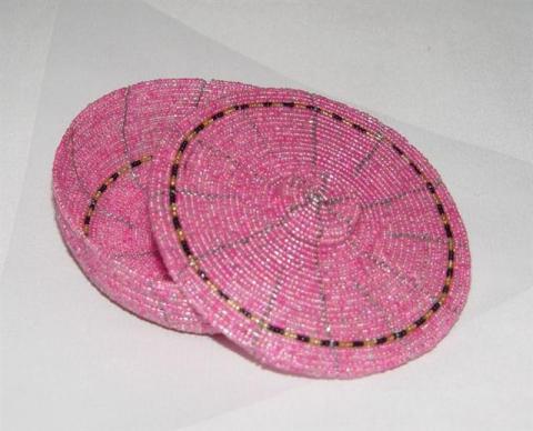 How long would it take you to string beads on wire and craft this unique item?! Five years? Ten? How easy to just buy it here instead! Approx. 6" in diameter with matching lid. Use for keys, jewelry, loose change. Specify color: pink, red, blue, green.