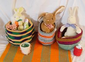 Variety of baskets (kiondos). Some are hand-woven by grandmothers raising HIV orphans in Kitui, Kenya. Made of hemp and yarn. Others are woven from hemp and have handles so that they can also be used as purses. Many are crocheted from recycled plastic grocery bags. They are perfect as Easter baskets, potted plant covers, kitchen utensil holders. Priced from $8-30. Diameters 6" to 15". Various colors. Each of these baskets has a story--great conversation starters. The grandmothers have no other way to help support themselves as they care for their orphaned grandchildren.